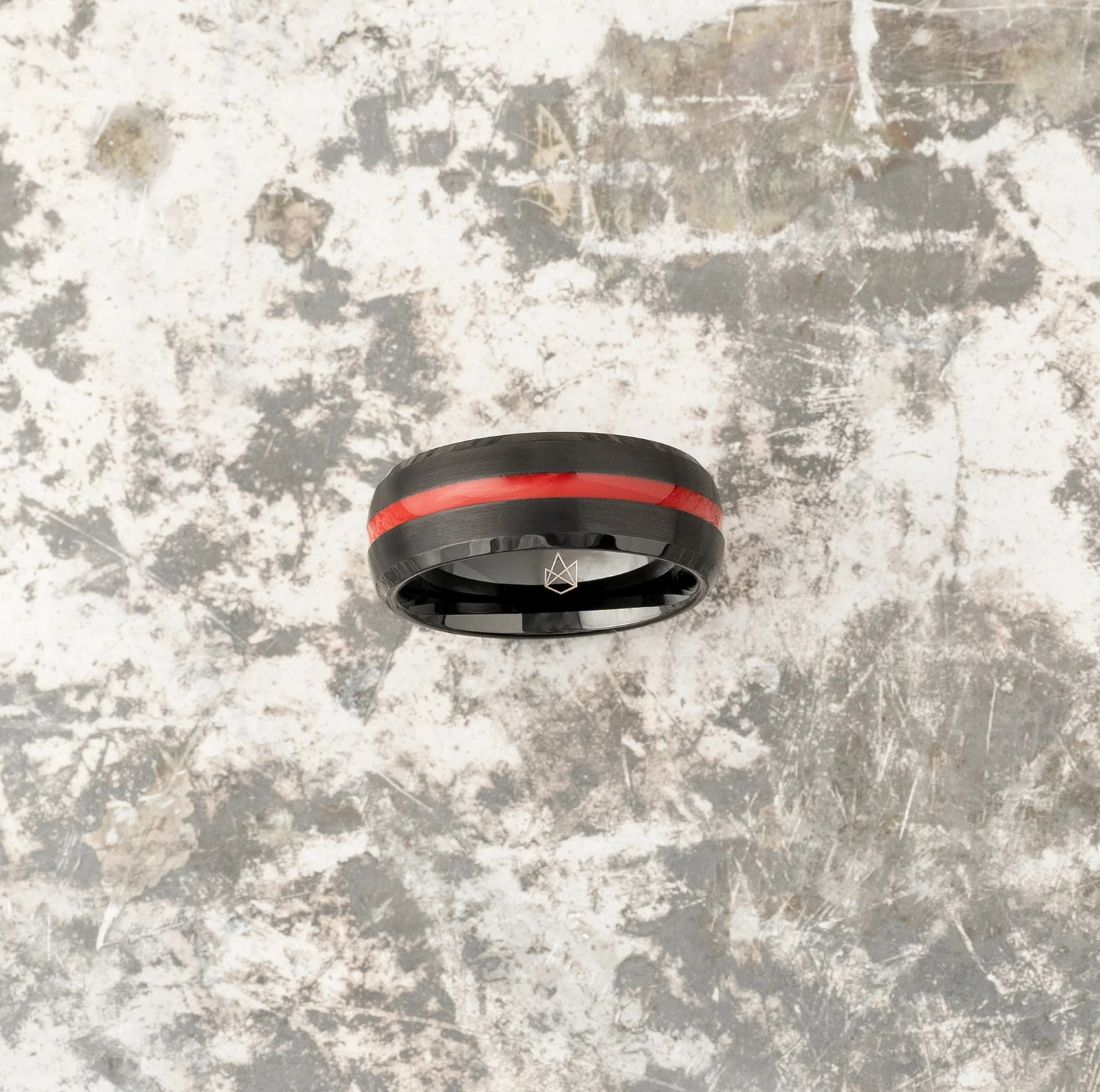 The process of creating the EMBR black tungsten band begins with taking a high-strength tungsten powder that’s combined with carbon to achieve its amazing strength. Each ring is then compression molded, sintered and polished, resulting in a remarkably smooth surface and an exquisite shine. The rich, luxurious shade of black tungsten carbide results from a PVD process, which deposits thin layers of color in a high temperature, vacuum environment. This process permanently changes the exterior surface color of naturally gray tungsten carbide to a deep onyx black. The process is then used to produce the Red coloring inlay, creating a truly beautiful combination.